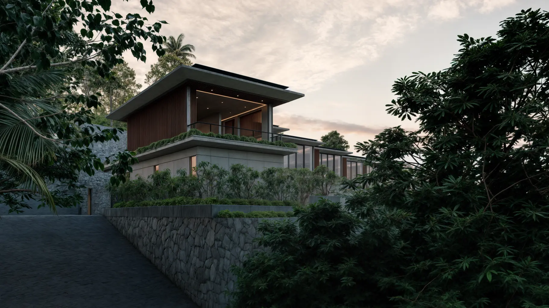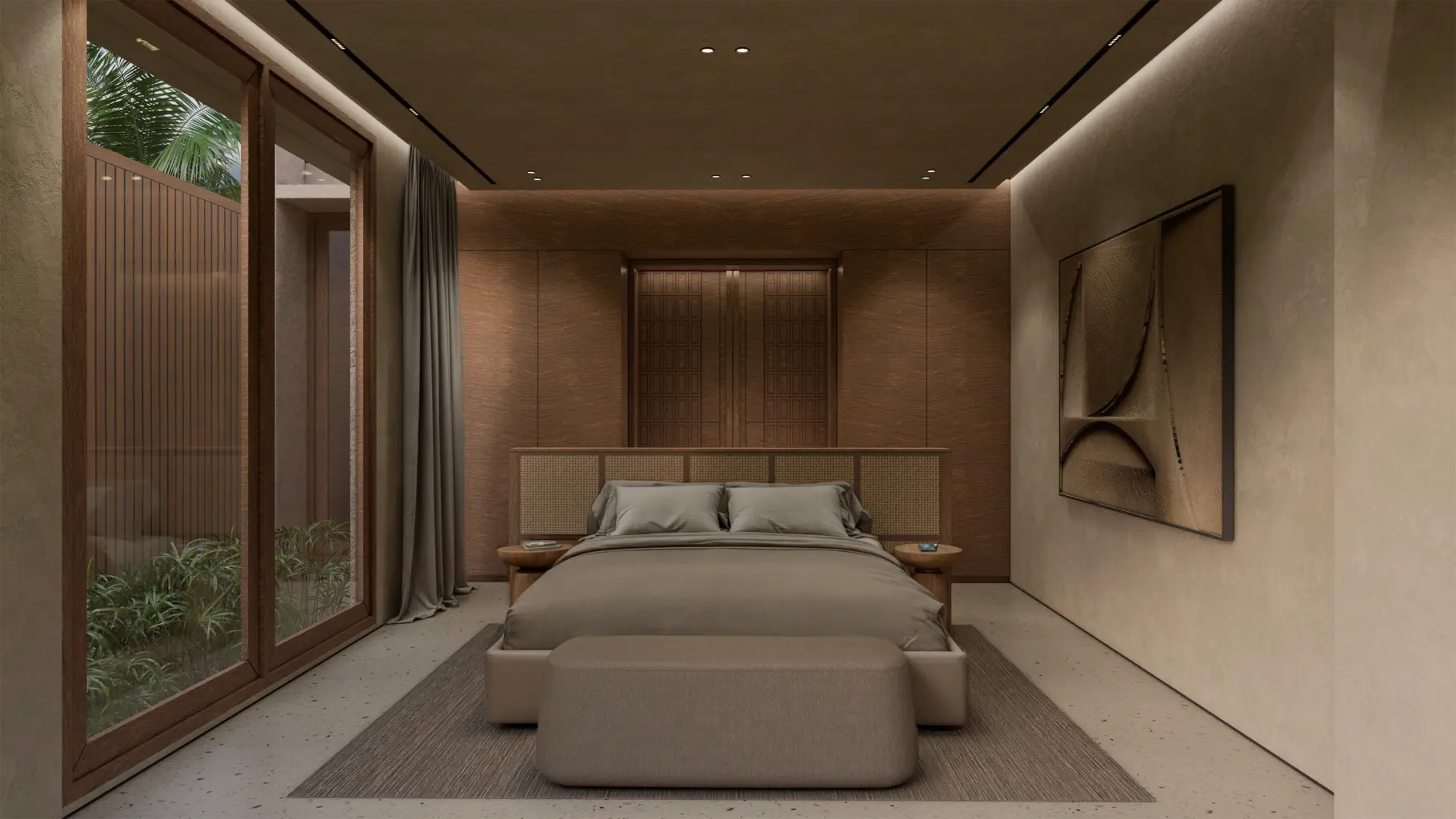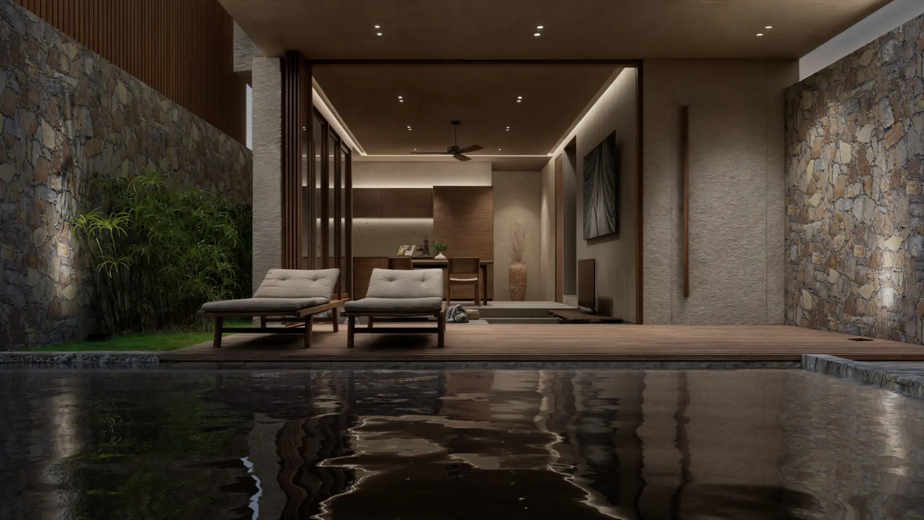Infinity 8 Villa is designed with a modern tropical minimalist architectural concept that emphasizes the balance between spatial comfort and connection with nature. This two-story building features clean lines, natural materials, and wide openings that allow optimal airflow and natural light throughout the spaces. The open-plan area on the ground floor connects directly to the swimming pool, creating a relaxed atmosphere that blends seamlessly with the tropical surroundings. Meanwhile, the upper floor is arranged with bedrooms oriented toward the view, offering both privacy and a serene visual experience.
