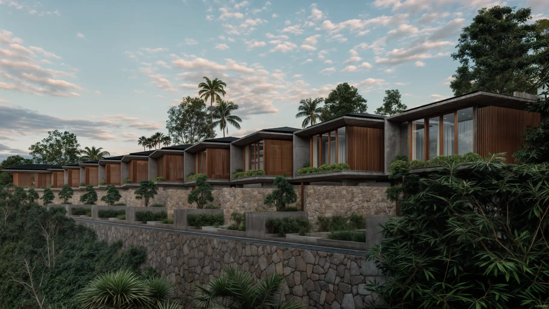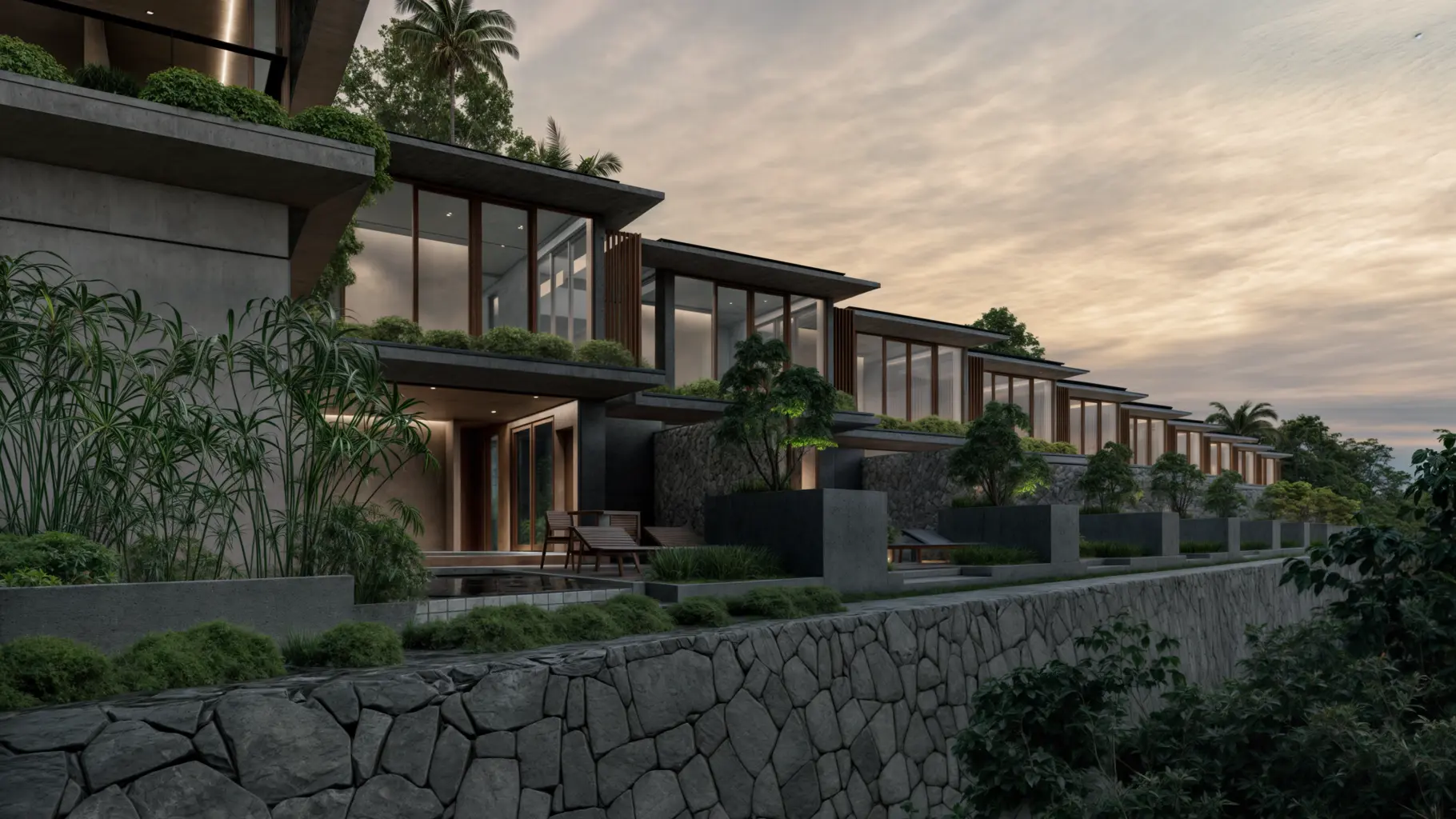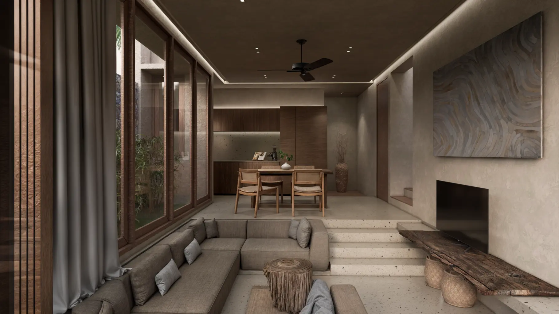Infinity 8 Villa is designed with a modern tropical minimalist architectural concept that emphasizes the balance between spatial comfort and connection with nature. This two-story building features clean lines, natural materials, and wide openings that allow optimal airflow and natural light throughout the spaces. The open-plan area on the ground floor connects directly to the swimming pool, creating a relaxed atmosphere that blends seamlessly with the tropical surroundings. Meanwhile, the upper floor is arranged with bedrooms oriented toward the view, offering both privacy and a serene visual experience.