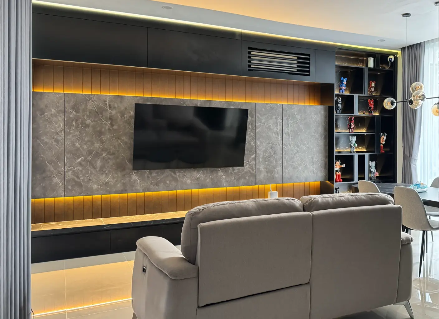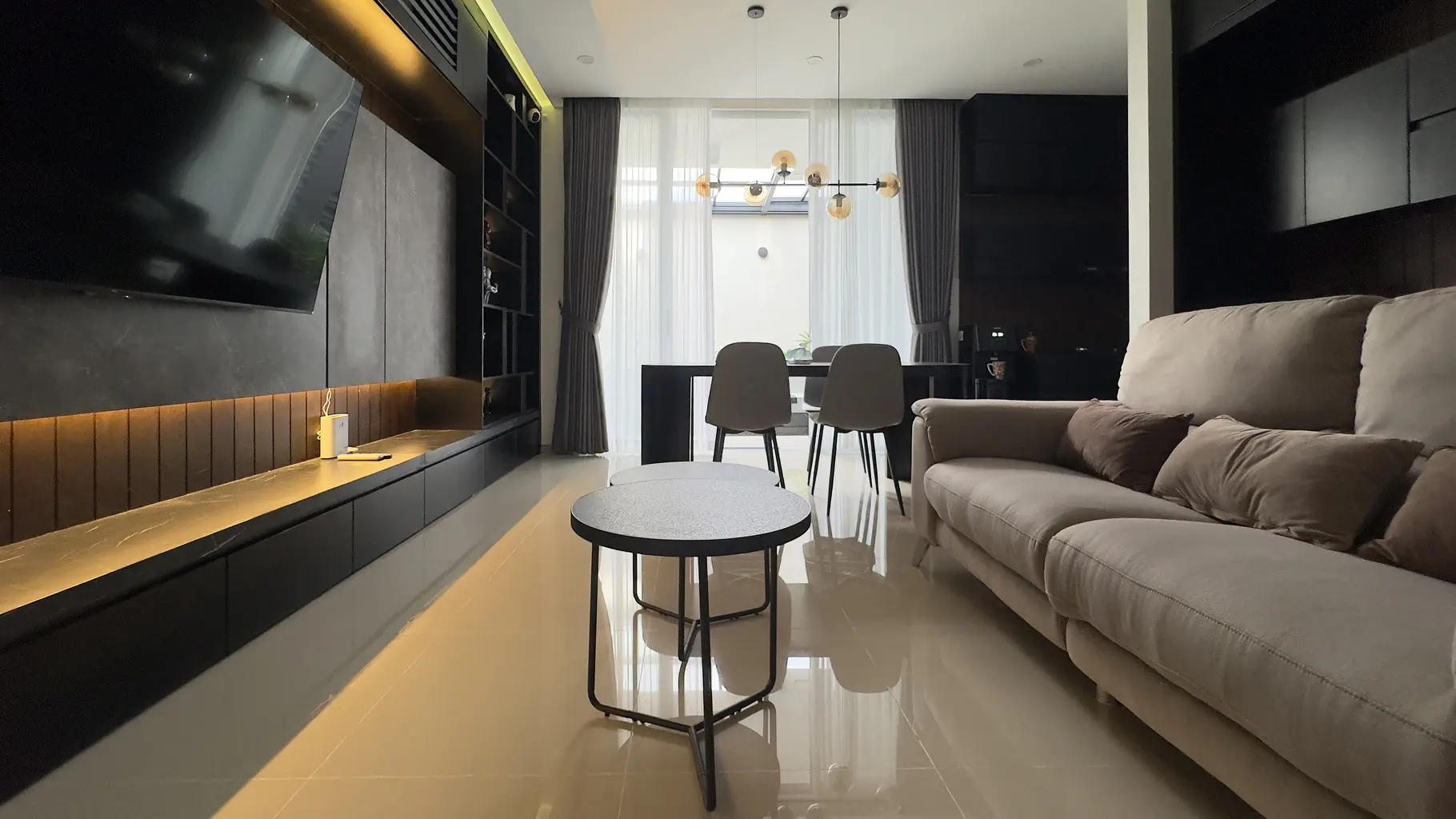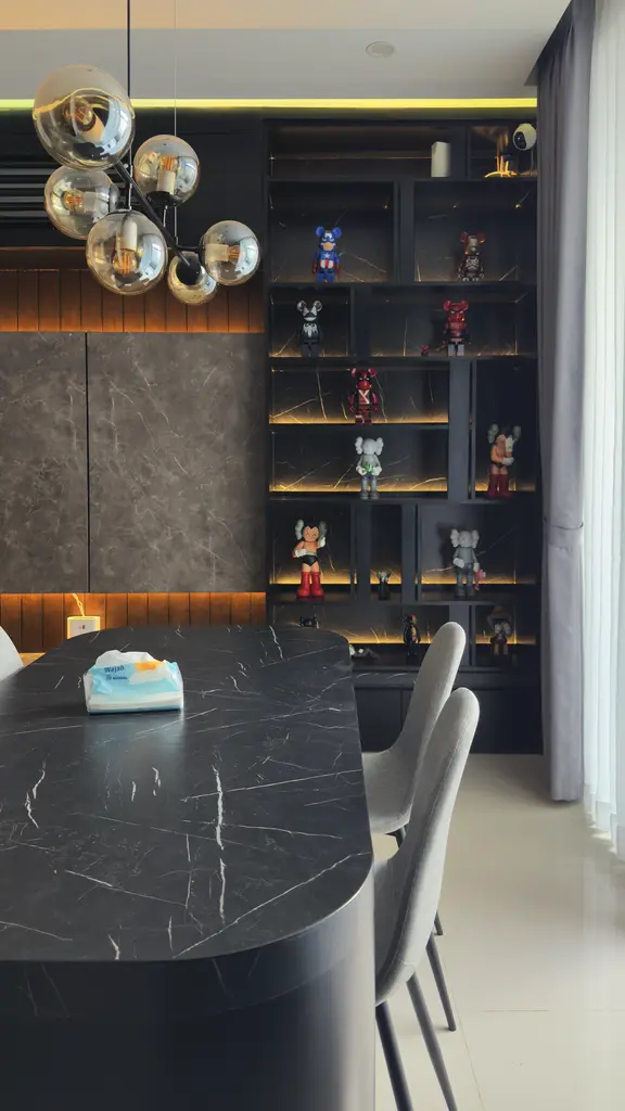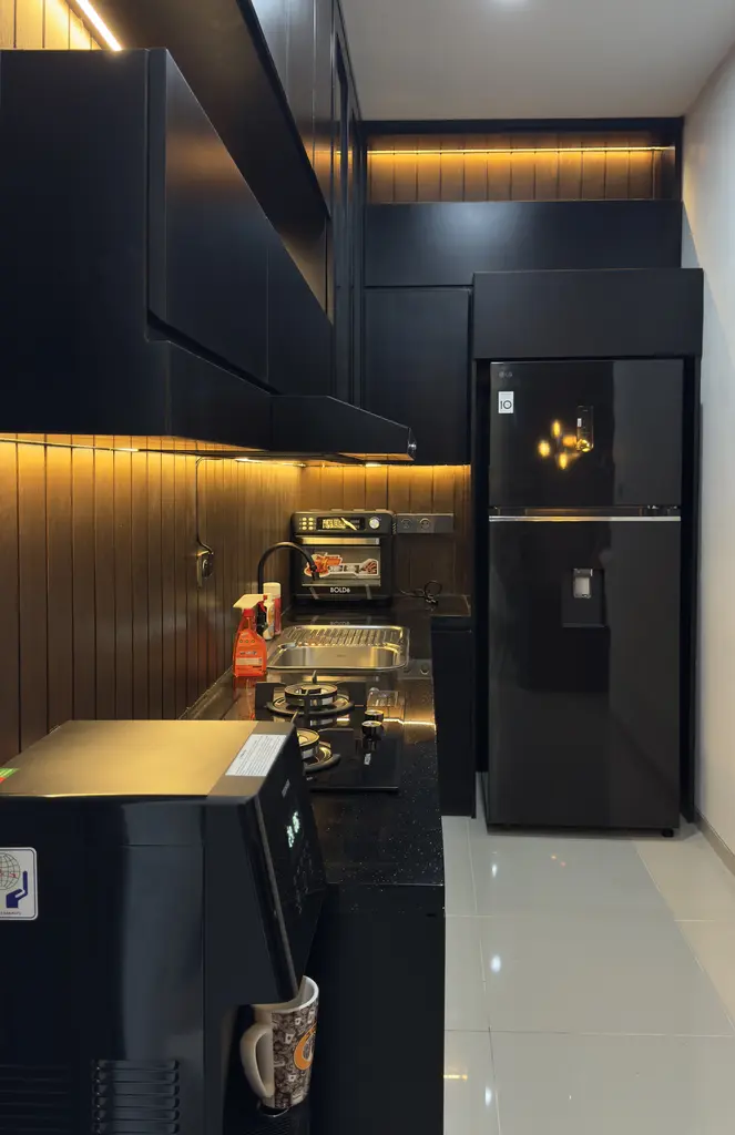 Grand Natura_B06 is a residential interior design project that embodies a modern minimalist style, emphasizing comfort and visual serenity. The combination of wood textures, neutral tones, and elegant black accents creates an atmosphere that is both warm and visually refined. The spaces are designed to be open and efficient, achieving a balance between functionality, natural lighting, and a calm modern aesthetic.