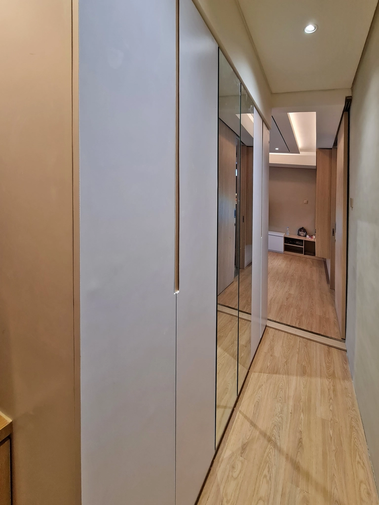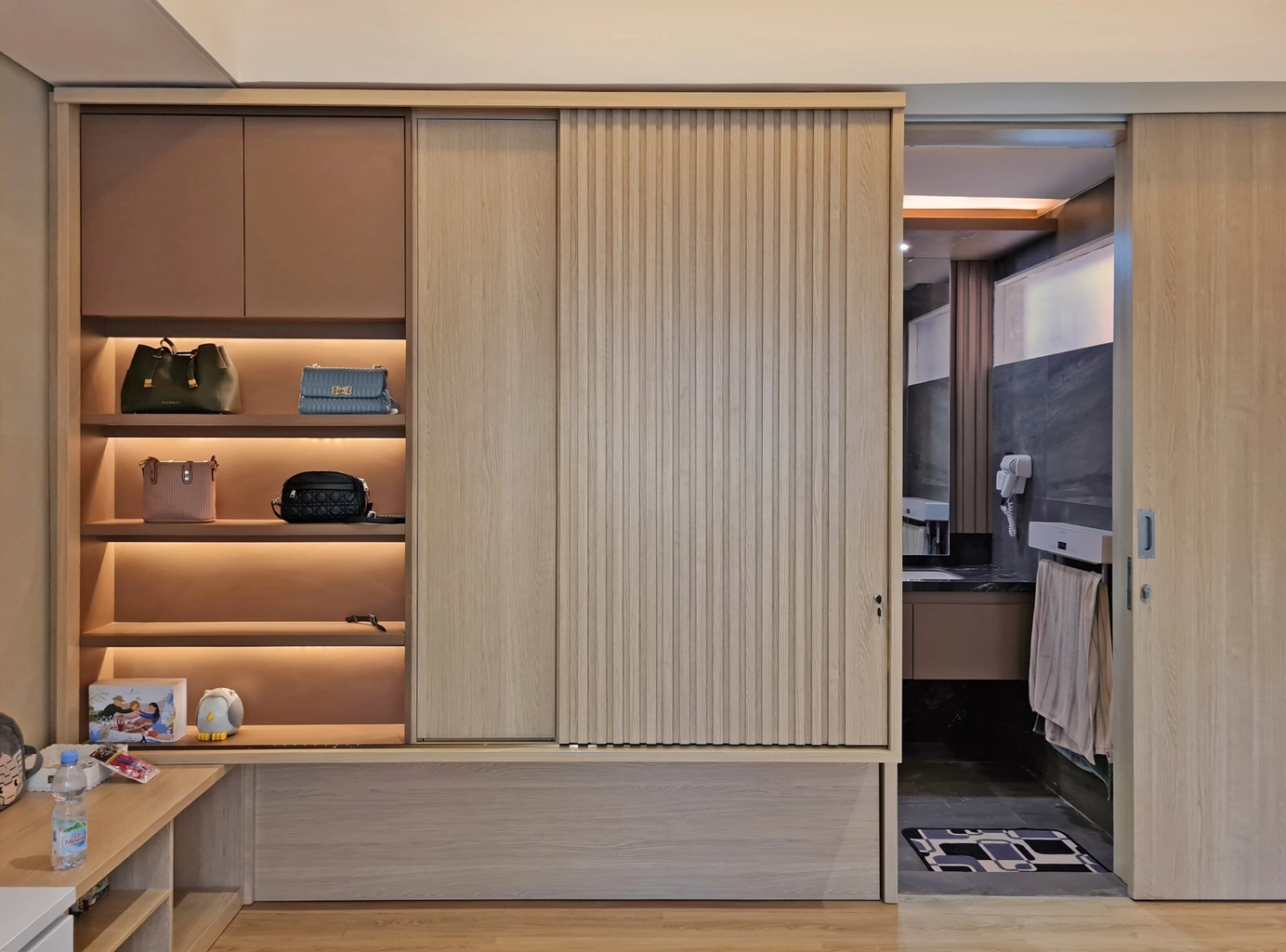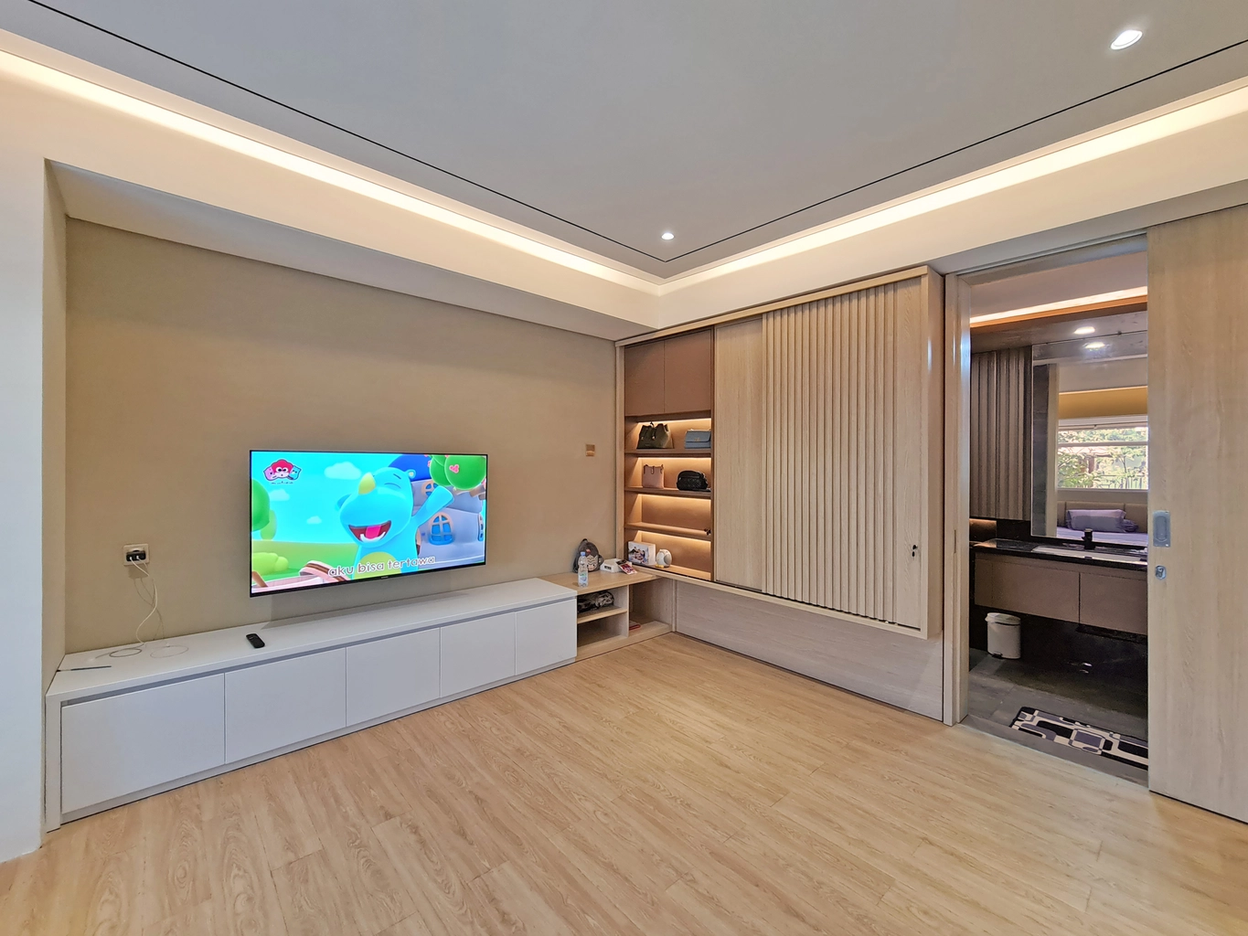 TI House is designed with a modern minimalist character, infused with warmth through the dominant use of light-toned wood materials. One of the rooms features horizontal lines on the ceiling combined with soft indirect lighting, creating a spacious and calming atmosphere. Concealed storage and illuminated display shelves highlight the room’s clean functionality and aesthetic appeal. The use of neutral colors such as cream, white, and beige enhances the clean and harmonious ambiance, while the opening leading to the workspace on the right adds visual connectivity between areas, offering a seamless and efficient spatial experience.