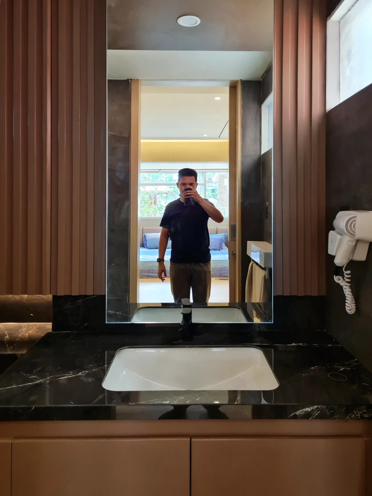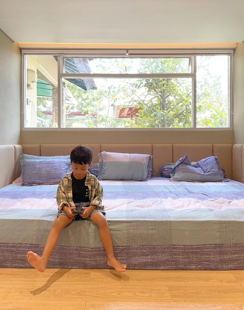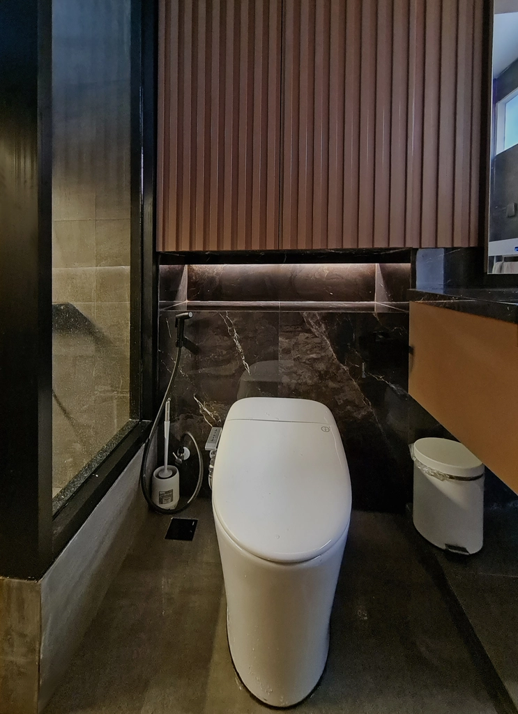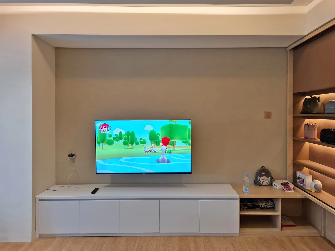 TI House is designed with a modern minimalist character, infused with warmth through the dominant use of light-toned wood materials. One of the rooms features horizontal lines on the ceiling combined with soft indirect lighting, creating a spacious and calming atmosphere. Concealed storage and illuminated display shelves highlight the room’s clean functionality and aesthetic appeal. The use of neutral colors such as cream, white, and beige enhances the clean and harmonious ambiance, while the opening leading to the workspace on the right adds visual connectivity between areas, offering a seamless and efficient spatial experience.