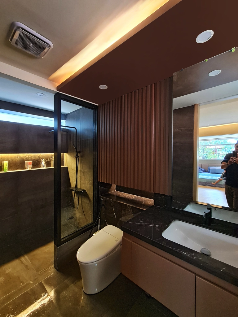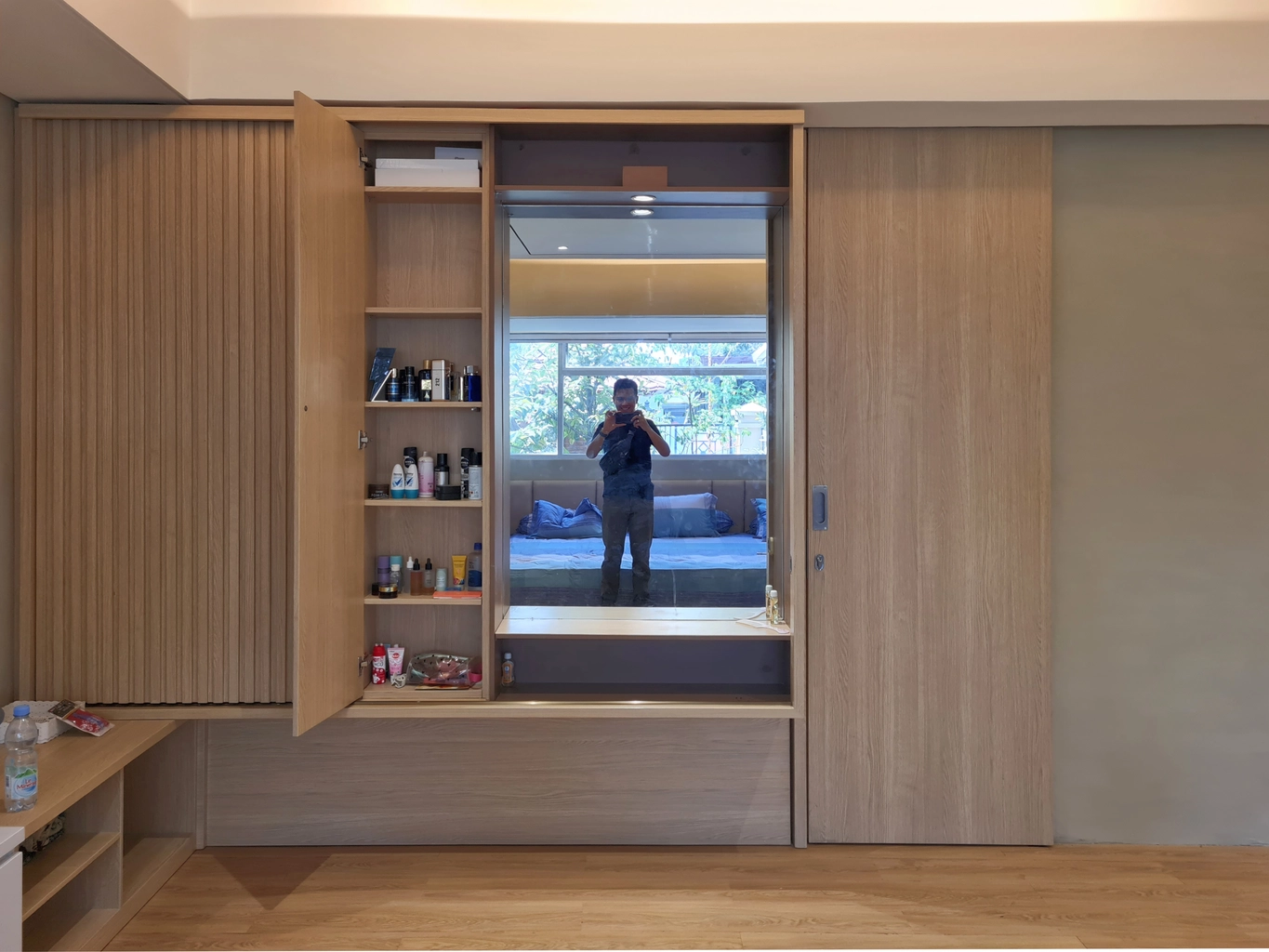 TI House features a modern minimalist design with warm accents from light-toned wood, complemented by soft lighting and neutral colors that create a clean, calming atmosphere. Concealed storage, illuminated shelves, and an open connection to the workspace enhance both functionality and spatial harmony.