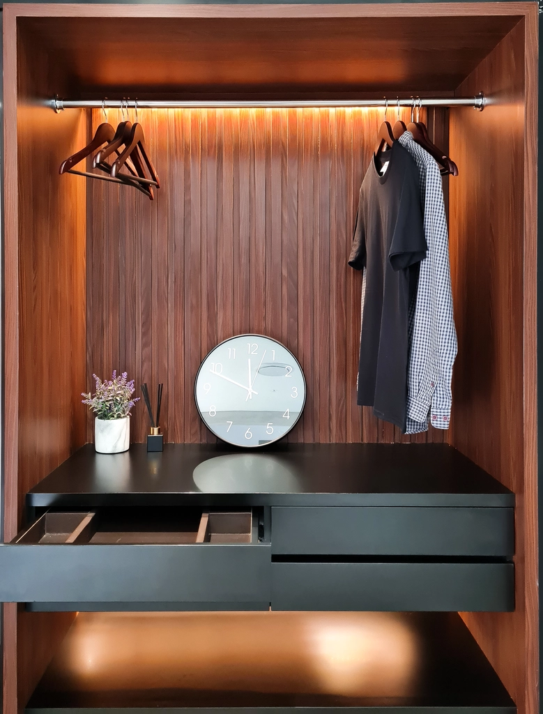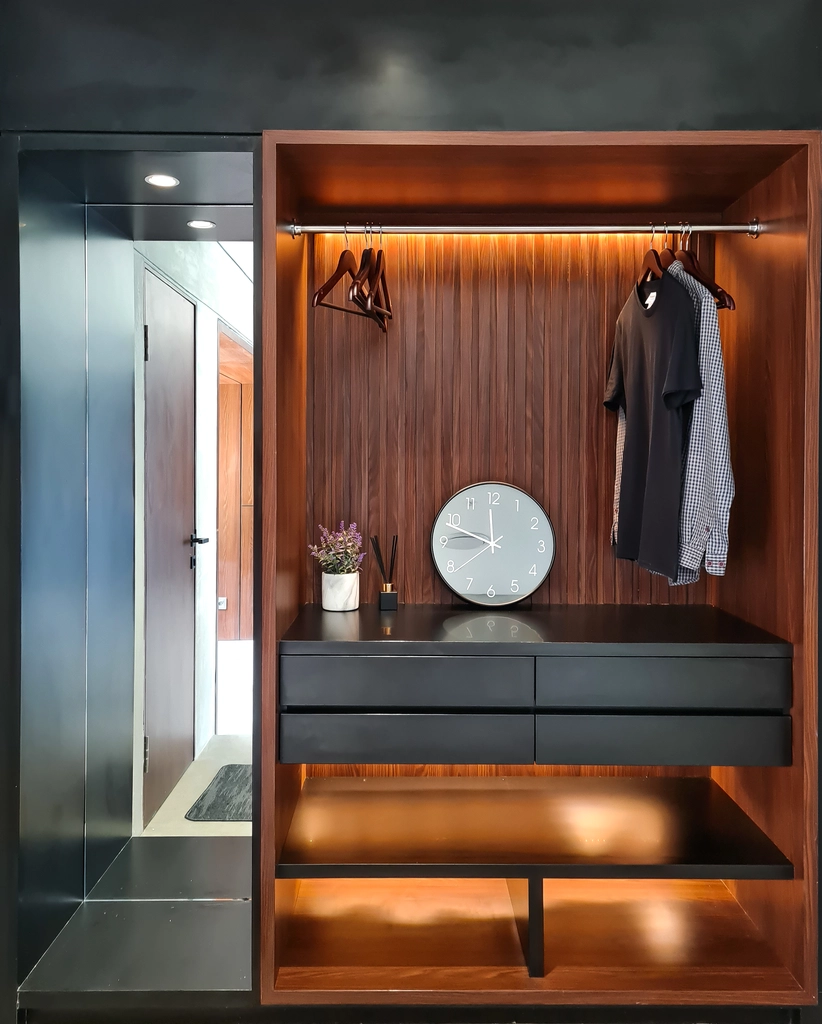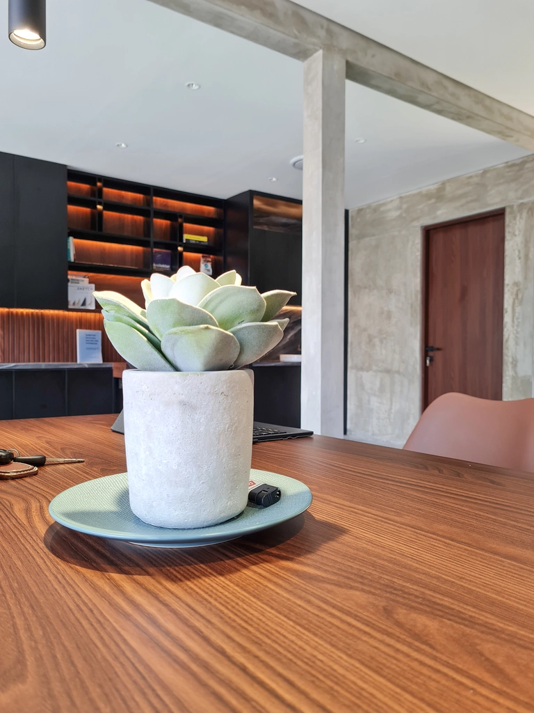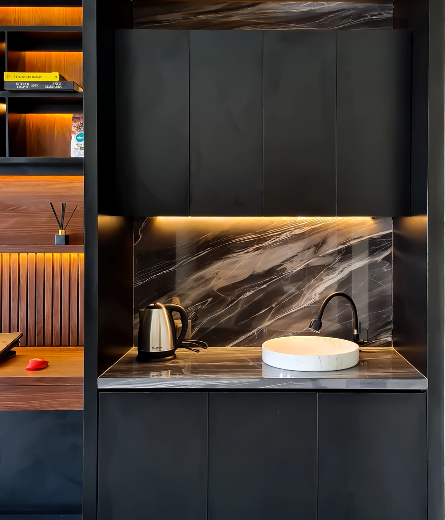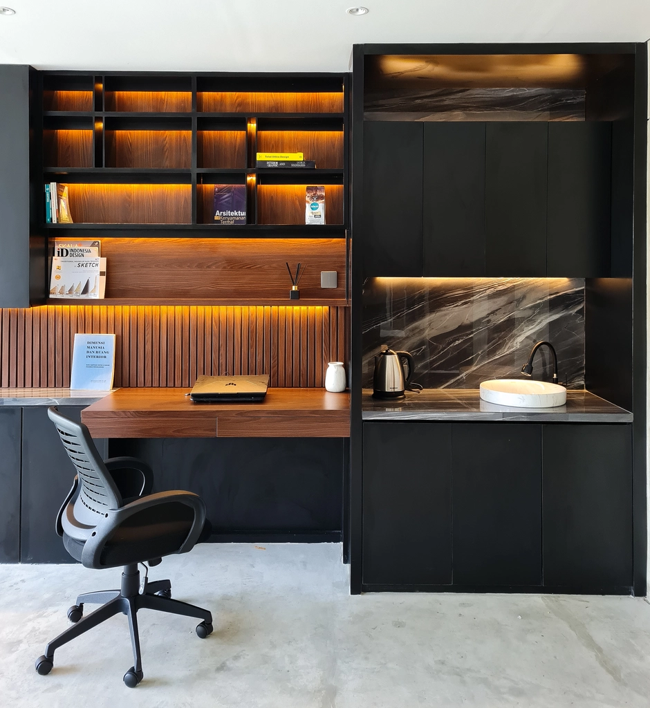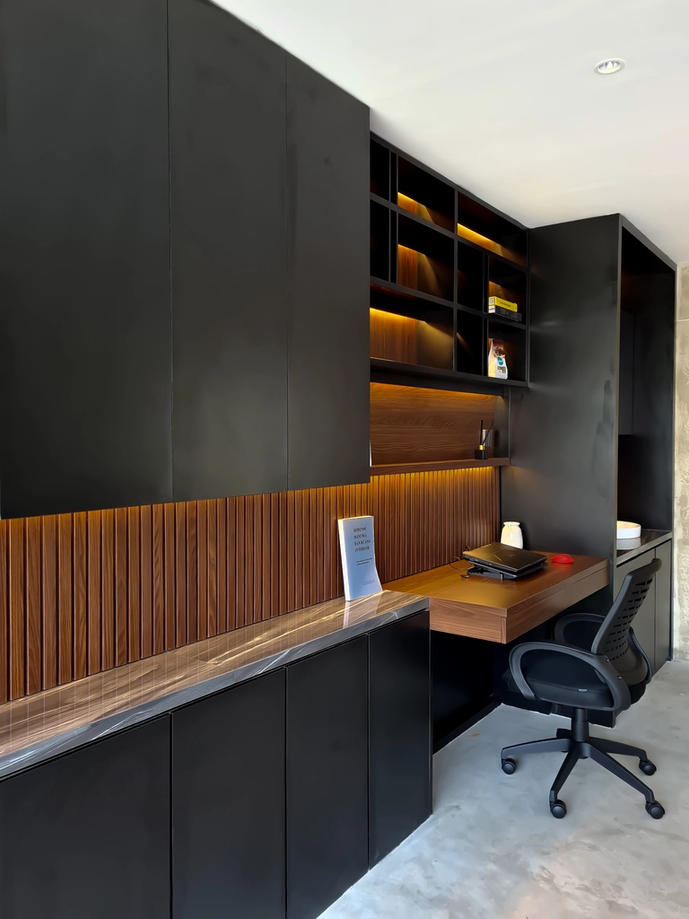 Siku Studio’s office features a sleek modern industrial design that seamlessly combines matte black finishes, warm wood accents, and subtle ambient lighting. The workspace is thoughtfully designed to be both efficient and elegant, fostering a serene yet productive atmosphere. The interplay between dark tones and wood textures creates a harmonious balance between industrial character and professional sophistication.